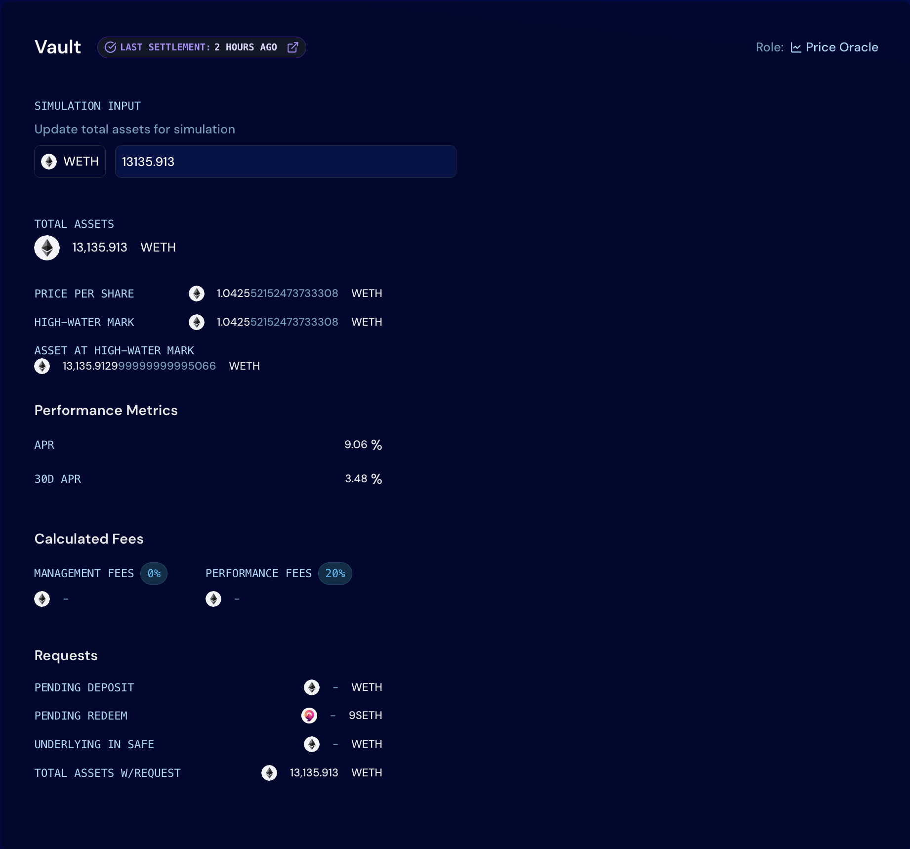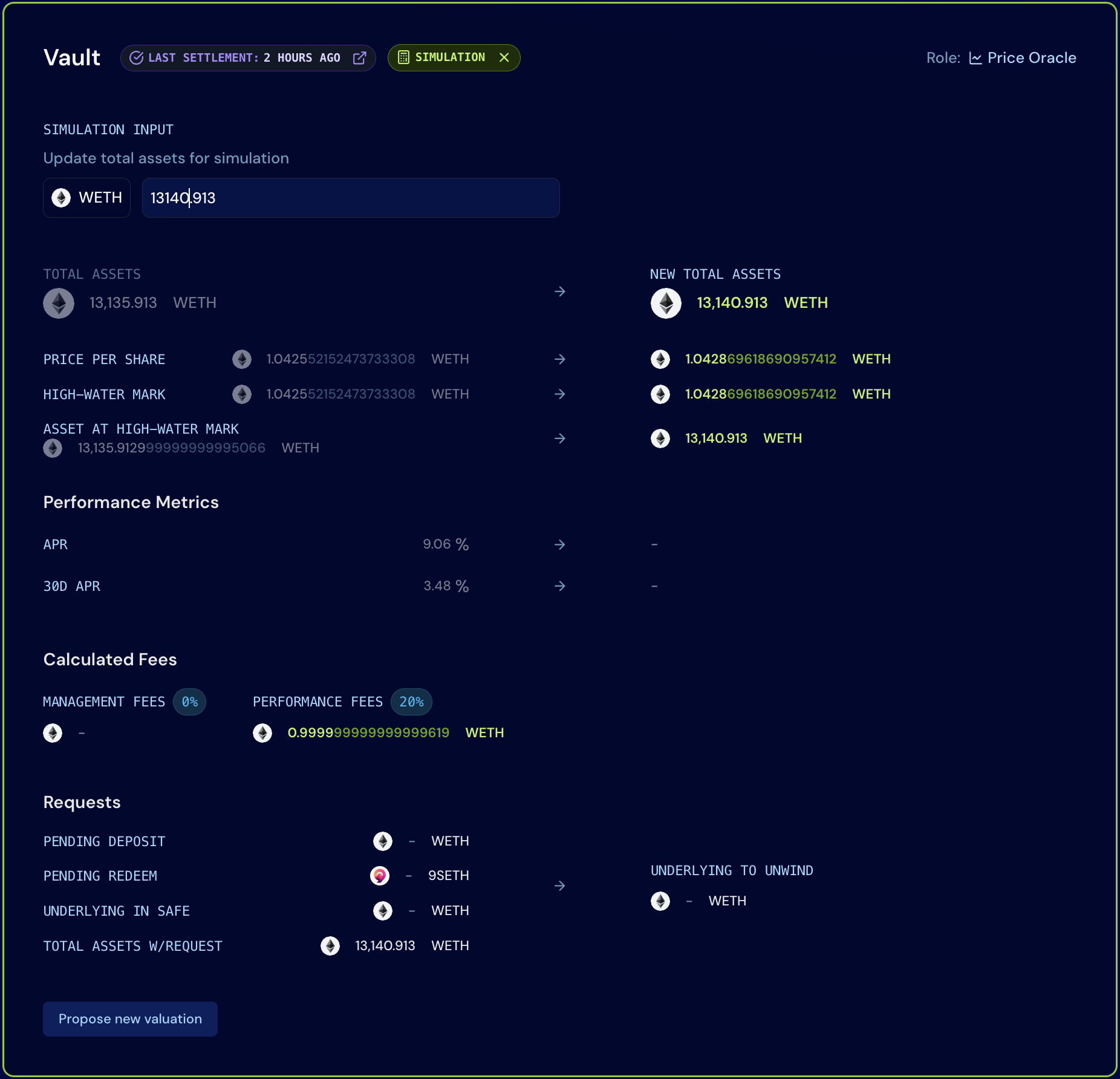 <figure><img src="https://2098527692-files.gitbook.io/~/files/v0/b/gitbook-x-prod.appspot.com/o/spaces%2F5vcVbvvRrtwZ0uaFrufF%2Fuploads%2FNQkUAwemSdeep22oJ1aF%2FScreenshot%202025-04-25%20at%2019.23.42.png?alt=media&#x26;token=d4edeef9-def4-4ccc-9157-78f4580b1ffa" alt=""><figcaption><p>Vault state with a new valuation</p></figcaption></figure>