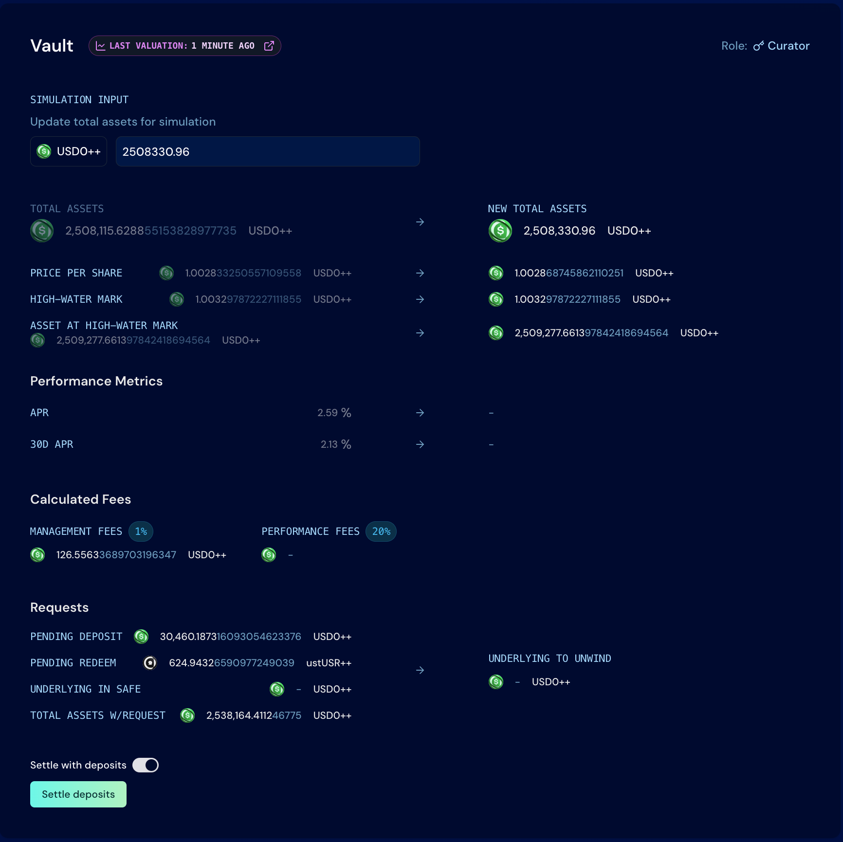* **Requests** - There are \~30,460 USD0++ ready to be deposited and \~624.94 ustUSR++ (vault shares) ready to be redeemed. To redeem the shares, the vault will use the assets being deposited and those present in the curator's address. It is the case because we are going to call `settleDeposit` , it would not be the case if we called `settleRedeem` .That's why the section *Underlying to Unwind* is empty; there are enough pending deposits to settle the redemptions.